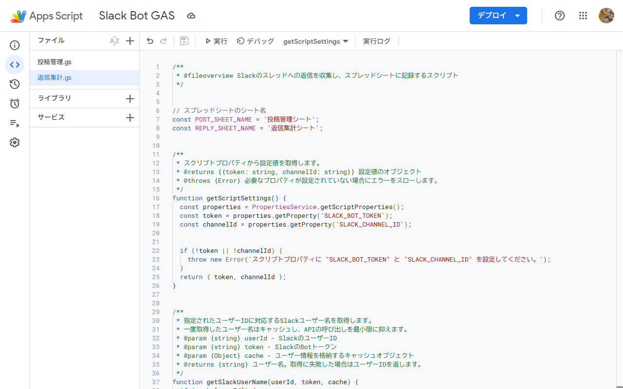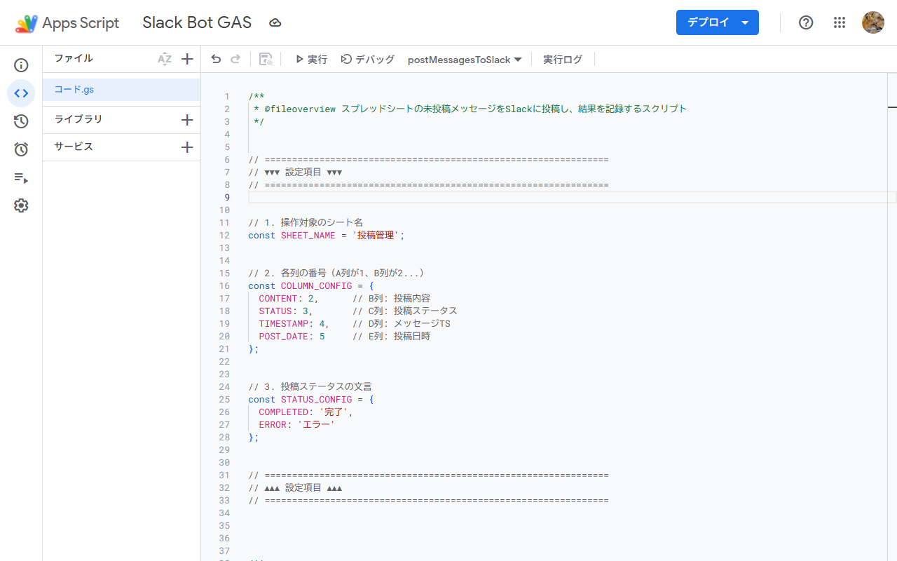AIが生成したコードをGASのエディタに貼り付け、変数名やシート名などが自分の環境と合っているか確認します。また、AIの回答通り'SLACK_BOT_TOKEN'と'SLACK_CHANNEL_ID'をGASのスクリプトプロパティに設定しました。