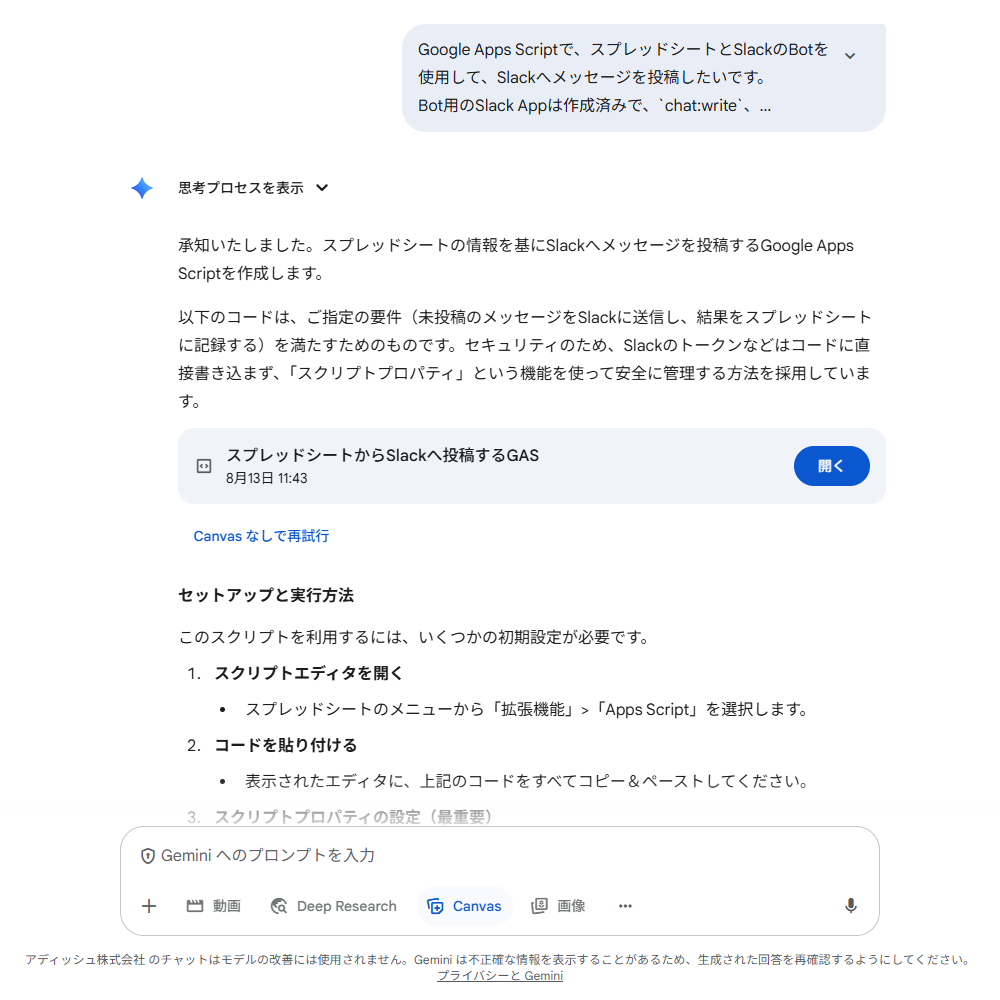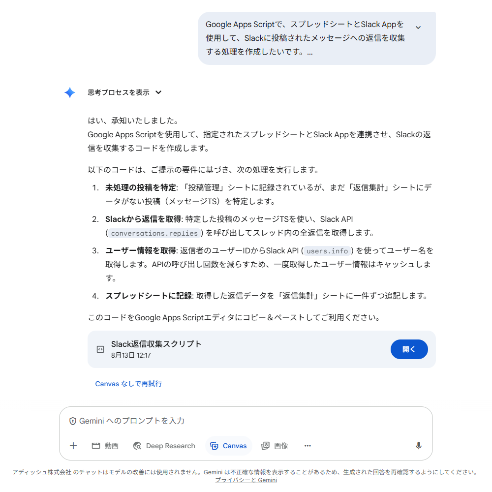 ここもAIに相談し、「4.Slack Appを作成し、GASと連携させる」で作成したスクリプトへ上限を超える返信が付いていた場合の処理を追加してもらうことで対処しています。