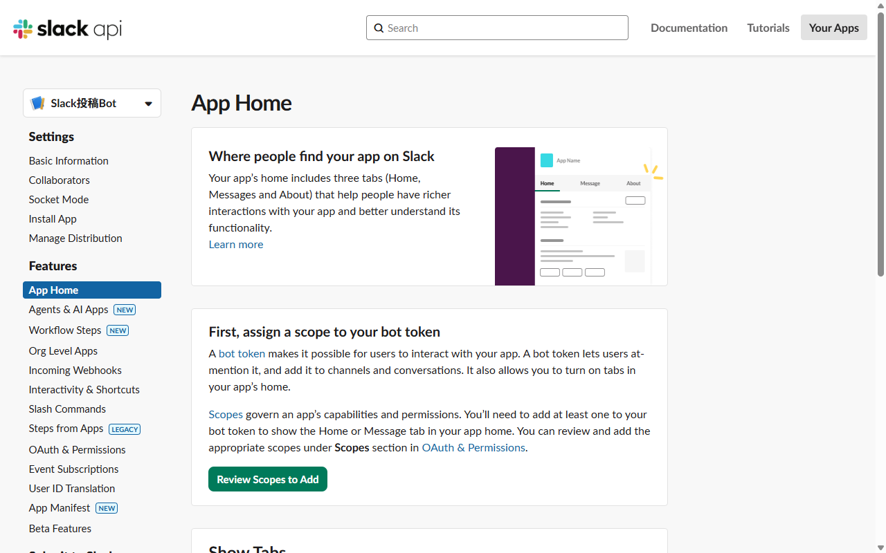 - Slack APIのWebサイトで新しいAppを作成します。