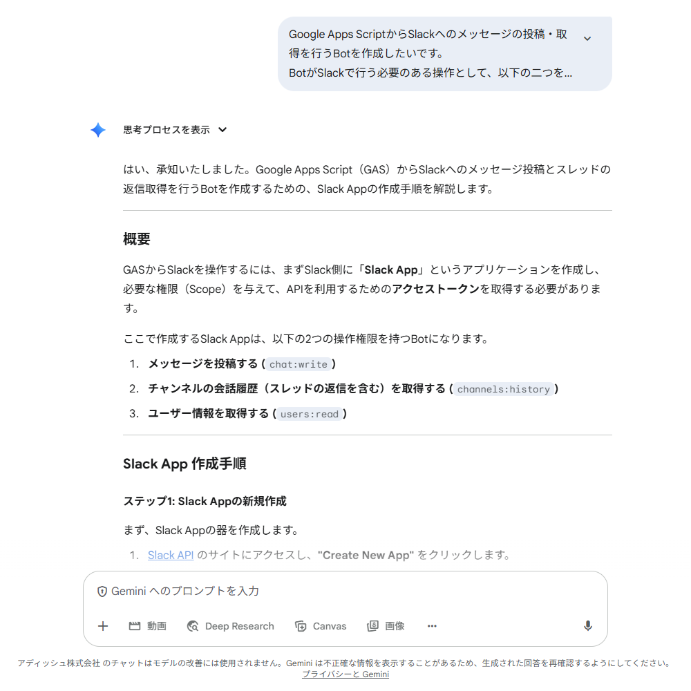 次に、Slackにメッセージを投稿したり、内容を読み取ったりするための「Slack App」の作り方をAIに尋ねてみます。