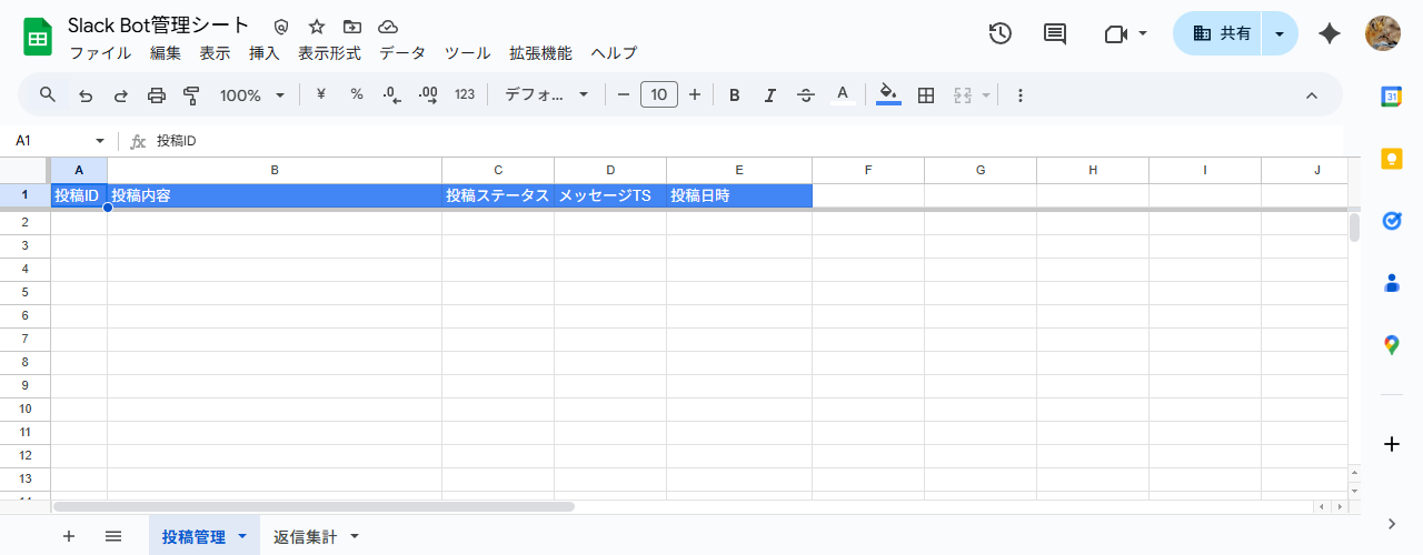 Slack BotがSlackへ投稿するためのテキストや、投稿後のスレッドへの返信を蓄積・集計するためのGoogle スプレッドシートを作成したいです。