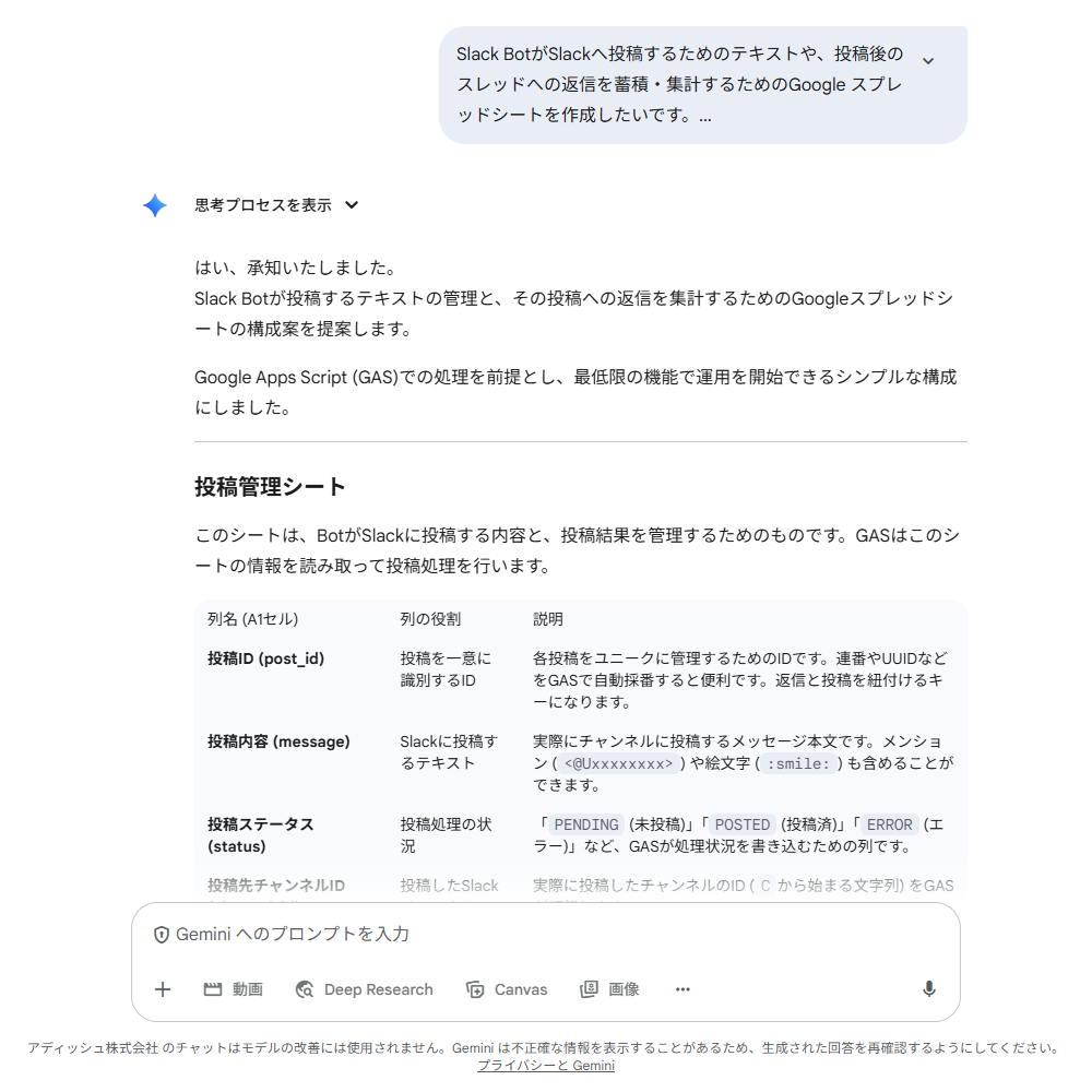 はじめに、Botが投稿するメッセージなどのデータを管理するためのスプレッドシートを準備します。どのような構成にすれば良いか、AIに相談してみましょう。